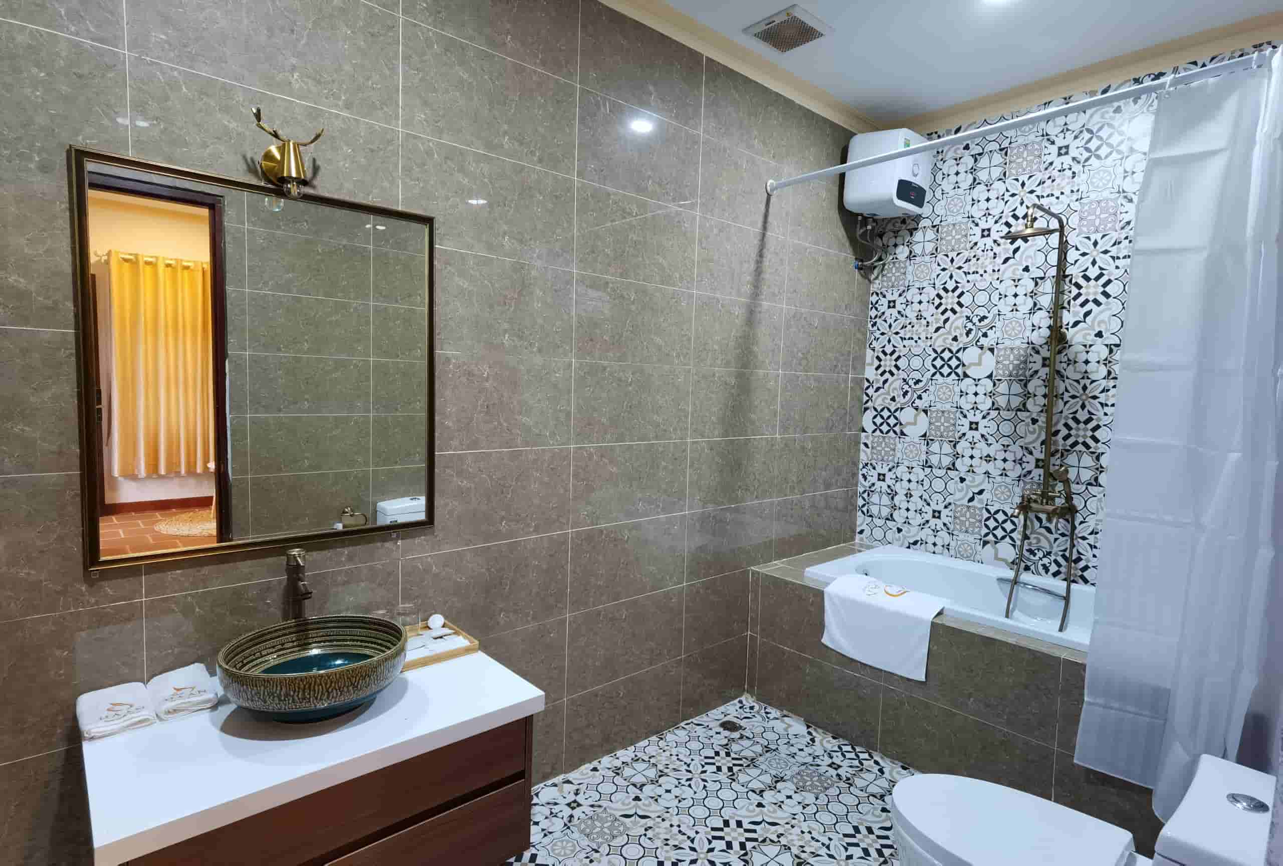 Phòng đôi Dandelion rộng 45m2, bồn tắm đứng, 2 giường Queen size cho 2 người lớn và 2 trẻ dưới 12 tuổi.